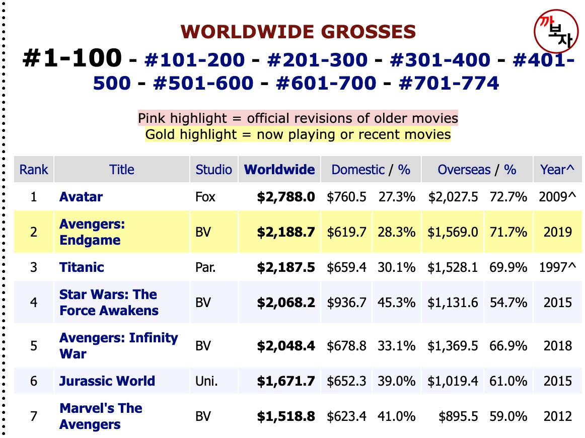 어벤져스 엔드게임의 제작비는 약 4100억원으로 현재 영화 정보 채널 박스 오피스 모조에 따르면 현재 전세계 영화 수익 순위에서 2위에 랭크되었습니다. 아주 대단합니다. 아바타를 따라 잡을 수 있을지 의문입니다.