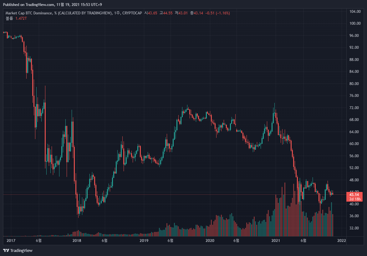 비트코인 도미넌스 차트이다. 암호화폐 중 비트코인이 차지하는 비중의 값을 시간대별로 알려주는 차트이다. 현재 BTC.D는 43%정도된다. 지난 폭락전 48%까지 상승하였던 도미넌스는 다시 40%를 향하는 모습을 보이고 있다. 비트코인 탭루트 업그레이드 등 다양하게 비트코인에 호재로 작용할 수 있었던 이슈들이 있었지만 미국의 규제와 단기매도세에 눌려 회복하지 못하고 점차 내려가는 모습을 보이고 있다. 현물ETF승인이 거절된 것도 조금의 영향을 미치지 않았나 싶다. 암호화폐 중의 근본인 비트코인의 가격은 언제든 급격한 움직임을 보여줄 수 있다고 생각된다.